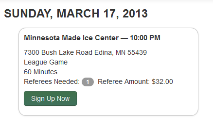 The game summary shows you the details of the pickup hockey or league game and how many referees are still needed. The summary also shows how much you will be paid for officiating the game. You can sign-up for the game by clicking the 'Sign-Up Now' button.